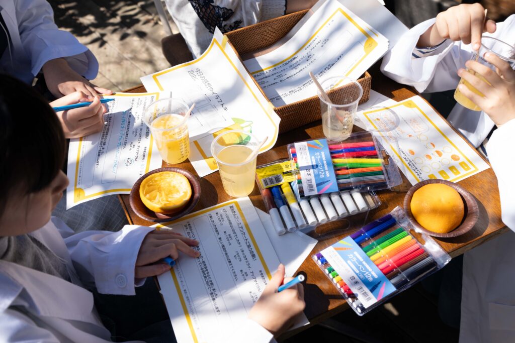 今回は、葉山の「夏みかん」を用い、皮を使ったディフューザー作りや、果肉を使ったドリンク作りなどのアップサイクル体験のほか、こんな商品あったらどうだろう?というアイディアワークショップ、食の多様性や日常の中にある「おいしさ」以外の楽しみ方を考えてみるコーナーなどが展開されました。